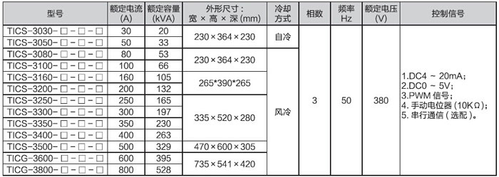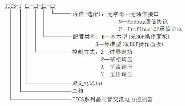 例如,訂貨號(hào):TICS-3200-Z-S-M,表示:TICS系列三相交流電力控制器——額定電流300A/周波調(diào)功/標(biāo)準(zhǔn)型/Modbus通信接口。